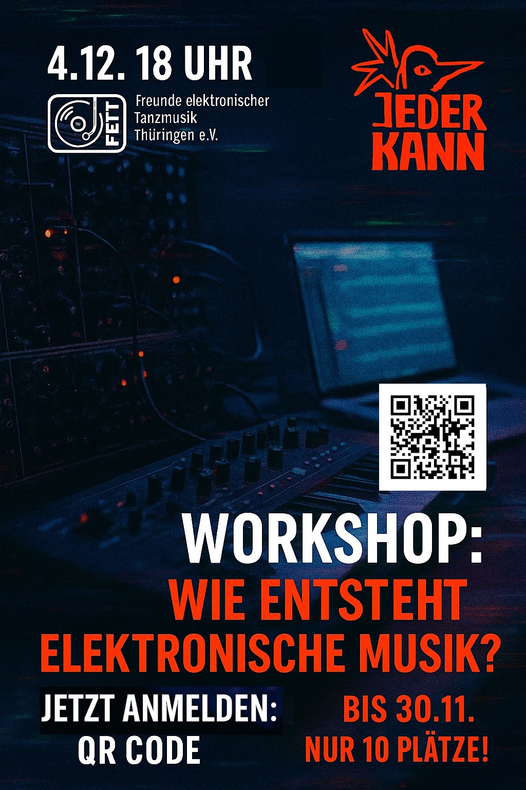 jederkann Galerie Leipziger Pl. 9, Erfurt, Thüringen, Germany🎛️ WIE ENTSTEHT ELEKTRONISCHE MUSIK? 🎶 Workshop für Jugendliche – jetzt anmelden! Du willst wissen, wie Beats, Sounds und Songs entstehen? Dann sei dabei bei unserem elektronischen Musik-Workshop – in der inspirierenden jederkann-Galerie in Erfurt! 📅 Wann? Mittwoch, 4. Dezember · 18–21 Uhr... ...